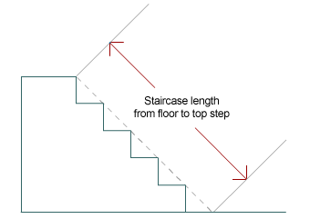 We need one last piece of information. Please take this measurement by running a measuring tape down the stairs from the top nose until it touches the floor at the bottom. It’s the measurement shown in the diagram with the dotted line. This is the rail length.